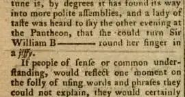 Most of the limbs of law do everything in a jiffy; but ask what they mean, and they would be as much puzzled, [...] if such gibberish were confined to hackney clerks of twelve shillings a week, we should not notice it (...) but the misfortune is, by degrees it has found its way into more polite assemblies, and a lady of taste was heard to say the other evening at the Pantheon, that she could turn Sir William B_____ round her finger in a jiffy.