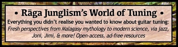 Hasn’t every guitarist felt constrained by the instrument’s sheer open-endedness? Ultimately, isn’t there more variety to be found via imposing a range of different constrictions? (…How much can you even appreciate your wider freedoms until they’re taken away?). Whatever the motive, tuning by spelling certainly leads you to stumble on some fresh, genuinely counterintuitive combinations – as we’ll see, it’s pretty much impossible not to find them once you get going. Here are three fairly well-established cases: