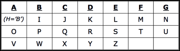 The so-called ‘French method‘ is probably the most straightforward – where you just write the rest of the alphabet under the ‘A-G letters in basic ‘left-to-right’ rows. While easy to grasp, its ‘many-to-one’ mapping ‘over-compresses’ the original input information, meaning that (even with full knowledge of the coding system itself) you can’t really decipher anything for sure by sound alone. In other words, every word has one melody, but each melody spells out several possible words…