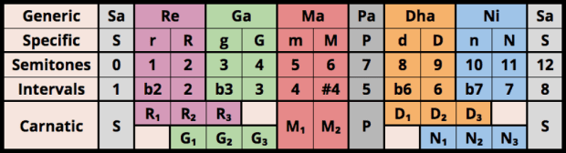 One method is to utilise India’s sargam system – which, much like Western solfège (‘Do-Re-Mi…’), matches scale tones to a system of seven note-syllables (the ‘sapta swara‘). In Indian classical, everything is kept relative: so the sequence always takes ‘Sa’ to be the root, regardless of absolute pitch (like the ‘moveable Do’ version of solfège):