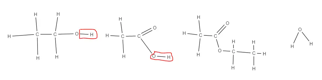 As we can see from the chemical equation, the ester has the same at one end, as well as like a carboxylic acid. However, the hydrogen is removed and replaced with the alcohol's hydrocarbon chain, . It is no surprised then that the ester is called ethyl ethanoate (the alcohol is the -yl and the carboxylic acid is the -anoate). Drawing the ester can be tricky though: