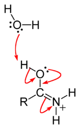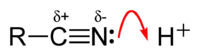 Nitrile hydrolysis proceeds by the mechanism outlined below. It begins with protonation of the nitrile nitrogen, which increases the partial positive charge on carbon and therefore renders carbon more susceptible to nucleophilic attack by a water molecule. Addition of water to the nitrile is the key step in nitrile hydrolysis − the next few steps are simple proton transfers, until an amide is formed. The amide then typically undegoes further hydrolysis to a carboxylic acid.