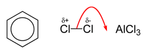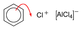 Once a suitably electrophilic species, E+, has been generated, it will react rapidly with benzene. A highly unstable intermediate (containing a tetrahedral carbon) is formed, which significantly disrupts the delocalisation of electrons in the ring. The intermediate immediately releases a proton in order to regain a fully aromatic ring and hence decrease its energy considerably.