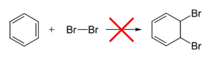 Arenes are much more stable and less reactive than alkenes. Unlike alkenes, arenes do not undergo electrophilic addition reactions because doing so would destroy the arene's aromaticity (stability due to electron delocalisation in a ring).