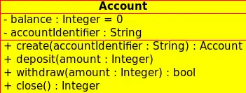 The diagram presented here represents a bank account. The bank account does not need to be described in all detail, we only need to know the amount of money that is currently in the account and how to identify the account. The operations that can be used on the bank account are create, deposit, withdraw, and close. We do not allow the client to withdraw a dollar and cents; they can only withdraw an integral value.