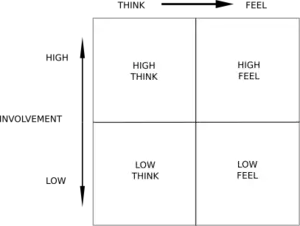 The FCB Grid was created by Richard Vaughn. With this model, messages are categorized by "thinking" and "feeling", "low" and "high."