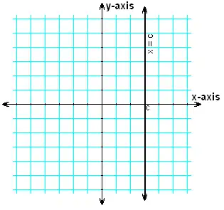 Its domain is set { C1 } and range is set R (unless otherwise specified). x = C1 is technically not a function (there is more than one value of y for each value of x), but it's a relation. Vertical lines have no slope (m = divide by zero, undefined, plus and minus infinity). These are the only types of linear equations of the general form shown previously which are not linear functions. The equation x = 0 is exactly the y-axis. Lines with steepness approaching vertical have very large-magnitude slopes but are still functions.