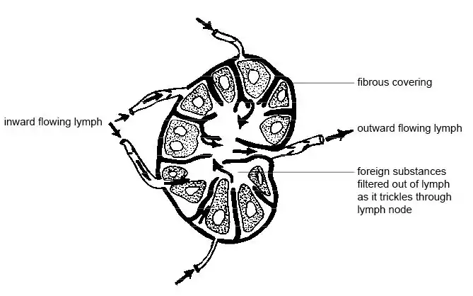 Lymphatic vessels have several similarities to veins. Both are thin walled and return fluid to the right hand side of the heart. The movement of the fluid in both is brought about by the contraction of the muscles that surround them and both have valves to prevent backflow. One important difference is that lymph passes through at least one lymph node or gland before it reaches the blood system (see diagram 10.2). These filter out used cell parts, cancer cells and bacteria and help defend the body from infection.
