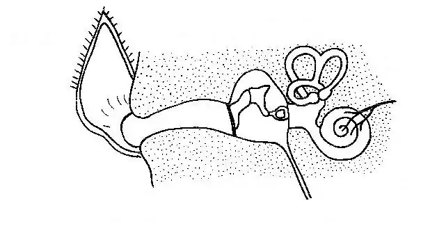 Most of the ear, the organ of hearing, is hidden from view within the bony skull. It consists of three main regions: the outer ear, the middle ear and the inner ear (see diagram 15.9).