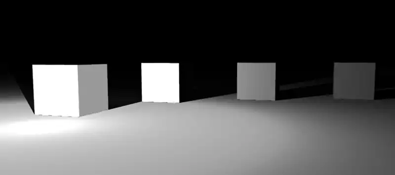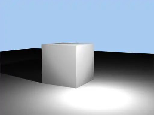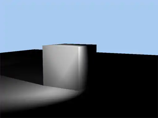 This is a Top view of a Box that is positioned just below and to the left of the light source. Notice that the shadow on the 60 cm Width Light appears to have a gradient on it unlike the nearly solid black shadow of the 10 cm Width Light. To get rid of the gradients, turn up the ray casts, and turn on multipass.