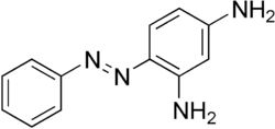 Chromophores of dye molecules often contain unsaturated groups such as >C=O and -N=N-, which are part of a conjugated bonding system, usually involving aromatic rings. Chrysoidine, a basic dye, is shown below: