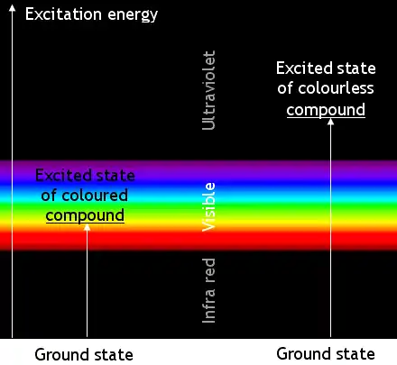 Most transitions are not caused by visible light. Many absorb ultra-violet radiation. Chemicals which absorb UV radiation are colourless (unless they fluoresce). The energy changes when molecules of a coloured compound and of a colourless compound are illustrated below: