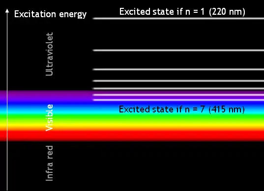 The diagram above shows the excitation energies of conjugated aldehydes. n is the number of C=C double bonds which are conjugated. The simplest (n=1) is CH3-CH=CH-CH=O. Note how the excitation energy is lower with higher numbers of conjugated bonds.