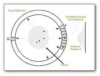 - If these gamma-rays are detected, their origin will lie on a line joining two of the detectors of the ring of detectors which encircles the patient;