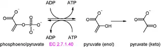 Step 10: Substrate-level phosphorylation. Pyruvate synthesis catalysed by pyruvate kinase:
