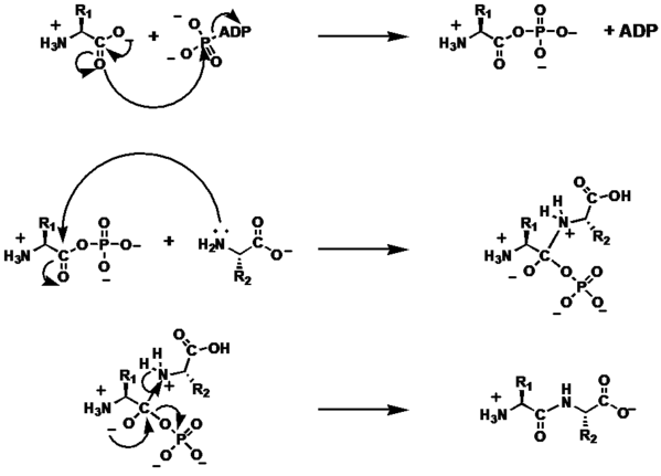The lone pair of the amino-terminus on the second amino acid attacks the carbonyl carbon of the phosphate ester, forming a tetrahedral intermediate with four substituents on the former carbonyl carbon: the oxylate ion, the phosphate, the nucleophile, and the alpha carbon of the first amino acid. Finally, the amine nucleophile is deprotonated to a neutral state.