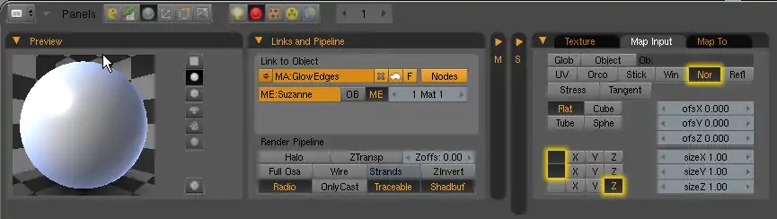 Back in the material buttons, go the "MapInput" tab and change the texture coordinates to Blank-Blank-Z and Nor and as demonstrated in the next screenshot:
