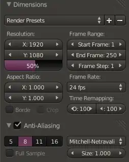 The dimension settings are pretty simple: the X slider defines the width (in pixels) of your render, the Y slider defines the height (also in pixels) of your render. Above the X/Y sliders is a menu with some handy presets for commonly used resolutions, such as 1080p, 720p, and different TV resolutions. Below the X/Y sliders is another slider showing a percentage, the percentage indicates what size the render will be compared to the X/Y values. In the screenshot the slider is at 50%, so the scene will be rendered at half the size of the full resolution (in this case half the size of 1080p). It is common to render at 50% resolution to decrease rendering time while developing a scene, before switching to 100% resolution for a final (slow) render.