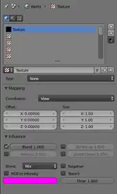 World texture settings look similar to texture settings: again there are a number of slots, and there are mapping and influence options. But the mapping coordinates types are different (and there is no UV option), and the influence types are more limited.