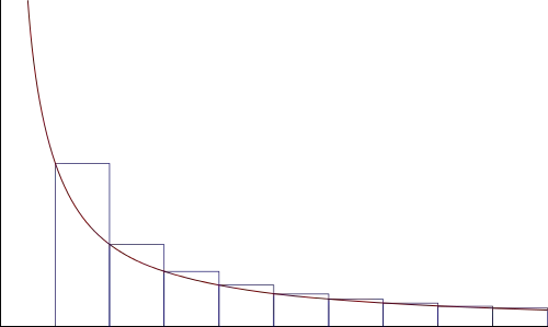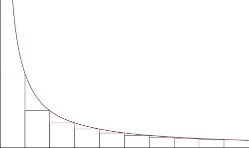 Let us look at why this this test works. As an example, we'll use the harmonic series . The harmonic series is well known series that actually happens to be divergent. This series actually passes the limit test, however it does not pass the integral test. If we want to approximate the integral, we can use rectangles like in a Riemann Sum: