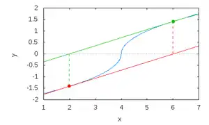 Newton's method may also fail to converge on a root if the function has a local maximum or minimum that does not cross the x-axis. As an example, consider with initial guess . In this case, Newton's method will be fooled by the function, which dips toward the x-axis but never crosses it in the vicinity of the initial guess.