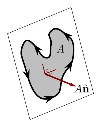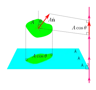 Given a flat surface as shown in the image to the right, this surface can be quantified by the "surface vector" which is a vector that is perpendicular (normal) to the surface in the preferred orientation, and has a length equal to the area of the surface. In the image to the right, a flat surface has an area of and is oriented to be perpendicular to unit-length normal vector . The "surface vector" of this surface is .