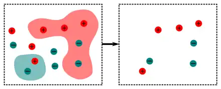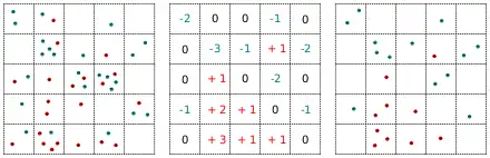 In the image below, the multi-point in the left panel is converted to the scalar field in the center panel by averaging the point weight over each cell. The volume of each cell should be infinitesimal. The multi-point in the right panel corresponds to the same scalar field, and is in a more canonical form where oppositely weighted points have cancelled out.