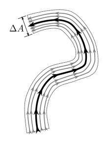 The image to the right gives a depiction of the Dirac delta function for a simple curve. The vector field is everywhere outside of an infinitely thin tube that encloses the path. Inside the tube, the vectors are parallel to the path, and have a magnitude equal to the inverse of the cross-sectional area. The Dirac delta function is the limit as the tube becomes infinitely thin.