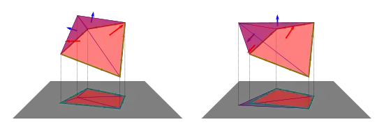 The fact that the total surface vector of a closed ribbon is means that if relief is added to a surface without changing its boundaries, the total surface vector is conserved. The two left images below give examples of distorting the interior of a surface by hammering in relief. The vertical surfaces introduced by the relief are ribbons which contribute to the total surface vector, while the horizontal surfaces are simply displaced vertically be the relief. The rightmost image below shows how the total surface vector is preserved if the "texture" of the surface at infinitesimal scales is converted from "steps" (a union of horizontal and vertical surfaces) to "smooth slopes" and vice versa. The surface formed from the red and green planes is a step, while the surface formed from the blue plane is a slope. These two surfaces can be seen to have equal total surface vectors from the right-angled triangle at the right side of the image.