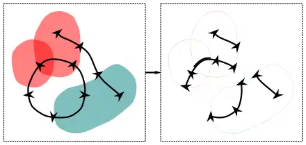 Consider a surface with weight from , and a volume with weight from . Let denote the counter-clockwise boundary of , and let denote the inwards oriented surface of . There are two sources for the counter-clockwise boundary of . Any time intersects , the intersection contributes to the boundary of . When leaves , the boundary of cannot follow, and instead must trace along the surface of while remaining in the surface as indicated in the image to the right. The boundary of the total intersection , denoted by , consists of two parts: the intersection of the boundary of with , denoted by , and the intersection of the inwards-oriented surface of with , denoted by . Therefore: .