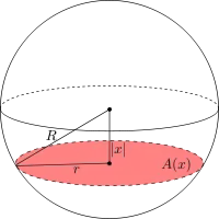 Formally the ideas above suggest that we can calculate the volume of a solid by calculating the integral of the cross-sectional area along some dimension. In the above example of a cylinder, every cross section is given by the same circle, so the cross-sectional area is therefore a constant function, and the dimension of integration was vertical (although it could have been any one we desired). Generally, if is a solid that lies in between and , let denote the area of a cross section taken in the plane perpendicular to the -axis, and passing through the point .
