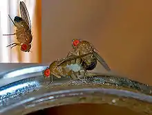 Mating fruit flies. Note the sex combs on the forelegs of the male (insert)