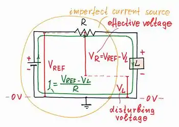 The real load introduces some voltage drop VL, which affects the excitation voltage VIN. Now, not all the input voltage is applied across the current-setting resistor R but only the voltage difference VIN - VL. In other words, here the voltage difference VIN - VL determines the current IOUT instead the voltage VIN. As a result, the current decreases: