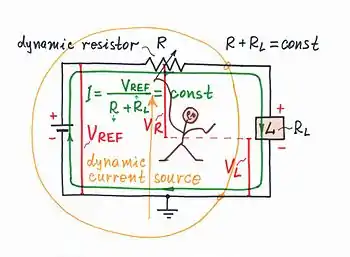 Vladimir: We might change the voltage... Yes, it is the one possible solution. Vladimir suggests, if the voltage drop VL across the load begins rising, the internal voltage VVAR of the current source to begin rising as well in the same direction with the same rate so that the difference VR between them to stay constant. This is the first idea: dynamic current source with following internal voltage. Till when will this magic continue? Of course, until VVAR finally reaches the positive supply rail. After that point, our wonderful "voltage-dynamic" current source becomes an ordinary passive one.