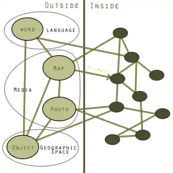 The rationale is as follows: We gain information about our external environment from different kinds of perceptual experience; by navigating through and interacting directly with geographic space as well as by reading maps, through language, photographs and other communication media. Within all of these different types of experience, we encounter elements within the external world that act as symbols. These symbols, whether a landmark within the real landscape, a word or phrase, a line on a map or a building in a photograph, trigger our internal knowledge representation and generate appropriate responses. In other words, elements that we encounter within our environment act as external knowledge stores.
