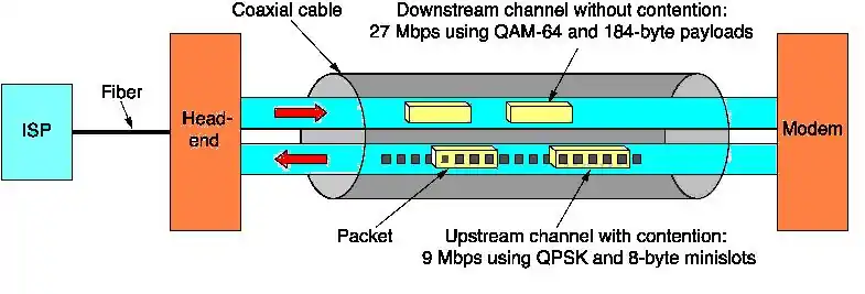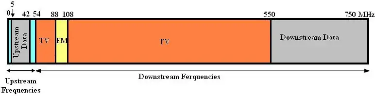 It is not practically possible to strictly use the cable network only for the purpose of providing internet connection. So there has to be a way of providing internet and cable TV through same cable. Normally cable channel occupy the 54-550 MHz region in which there is FM radio from 88-108 MHz. Each channel is 6 MHz wide. Some of the modern cable operates above 550 MHz, often to 750 MHz which is used as downstream data. The upstream channels are introduced in the 5-42 MHz band and frequencies at the high end for downstream. For downstream channel each 6 MHz channel is taken and modulated it with QAM-64(6 bit), so we get around 36 Mbit/s gross and net 27 Mbit/s payload without overhead. Thus total effective downstream bandwidth is 200 / 6 * 27 = 891 Mbit/s. For upstream QAM-64 does not work because of too much noise and terrestrial microwaves, so QPSK scheme is used which yields 2 bits per baud so we get around 12 Mbit/s gross and 9 Mbit/s net without no overhead. Thus total effective upstream bandwidth is 37 / 6 * 9 = 54 Mbit/s.