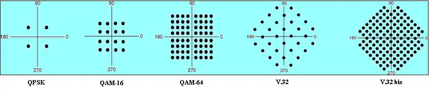 V.32 modem standard uses 32 constellation points to transmit 4 data bits and 1 parity bit per symbol at 2400baud to achieve 9400bps with error correction.
