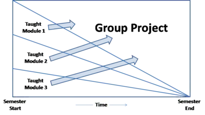 By way of camparison, Figure 3.3 shows the corresponding structure of a fully integrated PBL semester. The key features here are: • The semester is front loaded with 3 taught modules and the group project work increases throughout the semester as shown. • The 3 taught modules and group project are all directly related to a central theme of the programme discipline. • The taught modules still have written end-of-semester exams worth 50% of the overall marks. The other 50% is allocated to the group project which is assessed via a group project report and individual interviews.