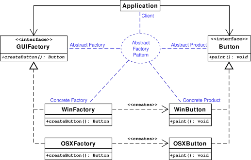 The output should be either "I'm a WinButton" or "I'm an OSXButton" depending on which kind of factory was used. Note that the Application has no idea what kind of GUIFactory it is given or even what kind of Button that factory creates.