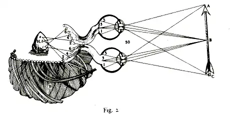 The naive realist idea of perception involves a point eye looking at a geometrical form. But the physics is different; there are two eyes with sometimes very different images in each. Light is refracted over the entire area of the cornea and directed over the entire area of the retina - there is no 'point eye'.