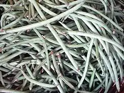 The black-eyed pea, also called black-eyed bean, ChawaLie, Lobia, etc. in various languages in India, is a subspecies of the cowpea, grown around the world for its medium-sized edible bean. The bean mutates easily, giving rise to a number of varieties. The common commercial one is called the California Blackeye; it is pale-colored with a prominent black spot. Other beans of somewhat similar appearance, such as the "frijol ojo de cabra" ("goat's eye bean") of Northern Mexico, are sometimes incorrectly called "black-eyed peas" and vice versa.