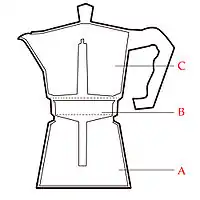 In Italy, the most common method of brewing coffee is in a moka-style percolator (Figure 3), which emulates the function of the aforementioned steam pressure brewing systems. Water is placed in the lower section (A) and the raw coffee grounds in the mid-section (B) with the spout reaching below the water level. After the top section, initially empty, is affixed, the pot is placed on a heat source. As the water reaches boiling point it turns to steam and eventually creates sufficient pressure to force all the water from the lower section up the tube at once, through the grounds — which are held in place by a metal filter above and below — and through a second tube until it hits the lid of the pot and is collected in the upper section (C), producing a strong, concentrated coffee. Gaskets and safety valves to ensure a tightly closed unit allow for pressure to safely build up in the lower section and provide a necessary security release if this pressure gets too high.