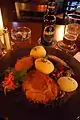 Other dishes include liver dumplings (quenelle) with sauerkraut and boiled potatoes, Träipen (black pudding) with apple sauce, sausages with mashed potatoes and horseradish, and green bean soup (Bouneschlupp). French cuisine is featured prominently on many menus, as well as certain dishes from Germany and Belgium.