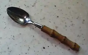 A grapefruit spoon is a utensil usually similar in design to a teaspoon that tapers to a sharp edge or teeth, the intent of the front serrated blade|serration being to separate the flesh of a grapefruit from its rind. Also called an orange spoon, citrus spoon, and fruit spoon, it is used for other citrus fruits, as well as kiwifruits and melons.