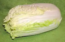 Nappa cabbage (also: NAPA cabbage, Chinese leaves, Chinese cabbage, Wombok, Baechu, Celery cabbage, Chinese celery cabbage, Peking cabbage, wong bok, petsai, shantung cabbage, hakusia, michihli and confusingly sometimes even bok choy) is a family of cabbages (Brassica campestris, Pekinensis group) used in Chinese and Korean cuisine. The cabbage head is tightly packed, taller than it is wide, and very light green with white near the base.