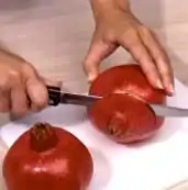 Pomegranates are a versatile fruit and can be used as a garnish on sweet and savory dishes or pressed to extract the juice. To use a pomegranate, cut it in half and pry out the pulp-encased seeds, removing any of the light-colored membrane that adheres. The seed pods tend to squirt when they pop, and you will invariably pop quite a few of them while handling a pomegranate. The juice will stain, so be sure to wear an apron or clothing that you don’t mind getting stained.