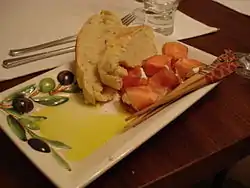 - Carpaccio of beef on chicory leaves and olive oil topped with Parmesan cheese and Provençal herbs decorated with grissini (breadsticks) and served with white bread