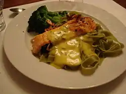 - Salmon fillet on green ribbon noodles with lemon-chives-sauce and florets of broccoli