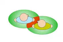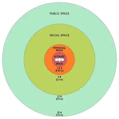Proxemics, coined by anthropologist Edward T. Hall in 1966, is the amount of space that people feel necessary to put between themselves and others as they interact. The category of proxemics is most commonly sub-grouped into a physical territory and personal territory, although proxemics can also be identified in several other forms such as eye-contact, facial expression, smells, body warmth, gender, and the number of people involved. The area of the personal territory is further sub-grouped as public space- ranging in 12–25 feet between people, social space- ranging from 4–10 feet between people, personal space between 2–4 feet of separation and finally intimate space- a foot or less of separation.[3] The physical distance between them is related to their social distance. For example, people who know each other very well often communicate in the intimate space, which is about 1.5 feet away from each other, whereas acquaintances will usually communicate about 12 feet from each other.
