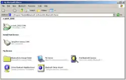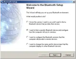 After the installation of your Bluetooth device, an icon named ”My Bluetooth Places” is appeared on your desktop. If it is not the case, right click on the Bluetooth icon in the system tray and select ”Start using Bluetooth”. Double-click on the ”My Bluetooth Places” icon. If you use ”My Bluetooth Places” for the first time, this action will open a wizard. Follow the instructions of this wizard up to arrive at the window depicted in the first figure of the wizard. If you already used ”My Bluetooth Places”, click on the ”Bluetooth Setup Wizard” item. This action will open this window.